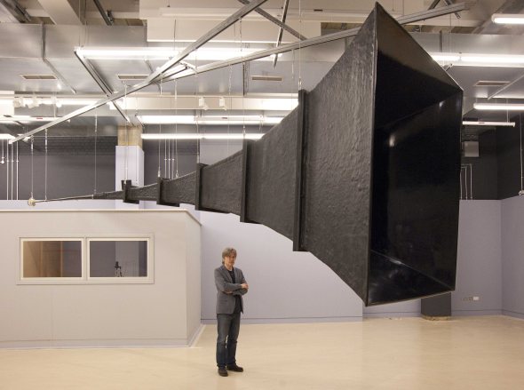 Aleksander Kolkowski and the Denman exponential horn, with the Resonance FM studio in the background
